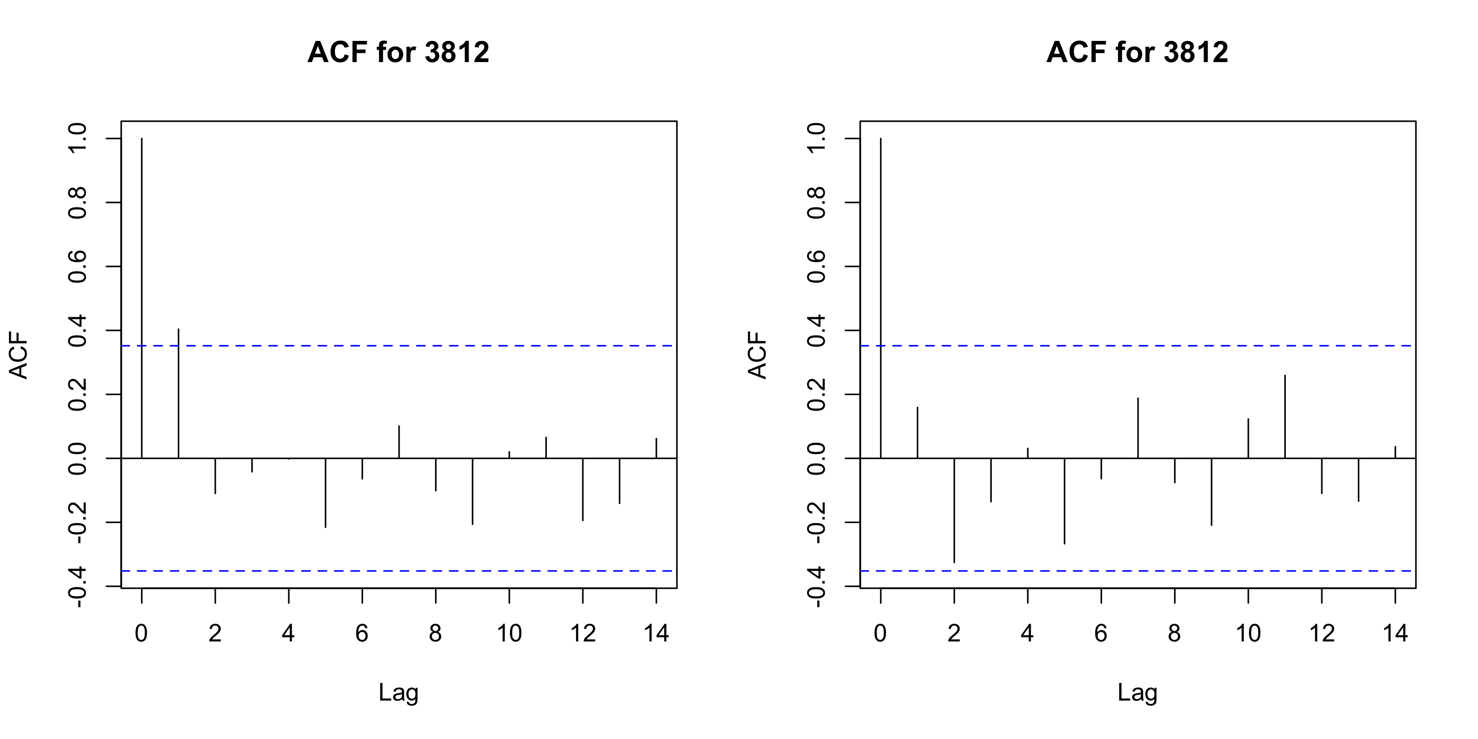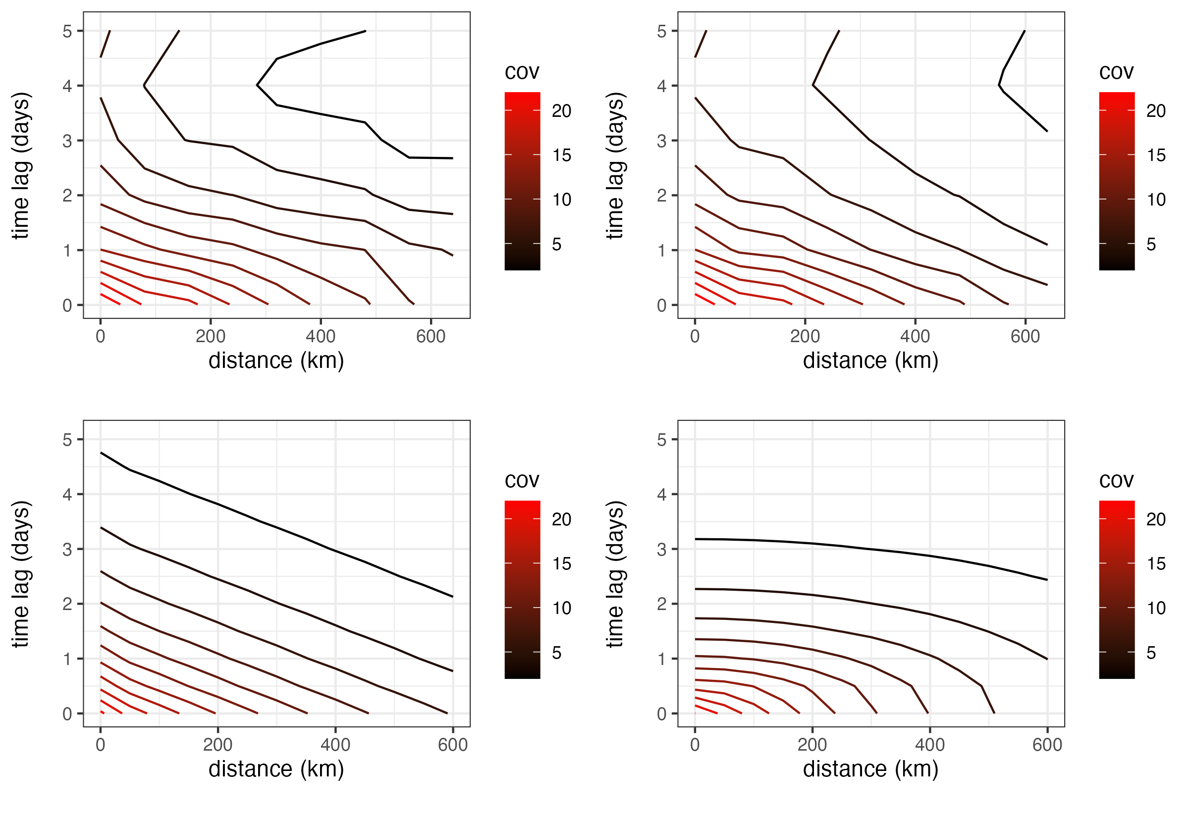 Consider the maximum-temperature observations (Tmax) from the NOAA data set presented in Chapter 2. After removing the obvious linear trend in latitude, we consider the empirical isotropic spatio-temporal covariance function (discussed in Section 2.4.2) calculated for the residuals, shown in Figure 4.4 (top left panel), and we compare that to the empirical model in Figure 4.4 (top right panel). That is, we are simply considering the product of \(\hat{c}(0;|\tau|)\) and \(\hat{c}(\|\mathbf{h}\|;0)\). Note that these two plots are remarkably similar, giving visual support for a model in this case. We shall discuss the lower two panels of this figure in Section 4.2.3. See Crujeiras et al. (2010) and references therein for formal tests of separability.