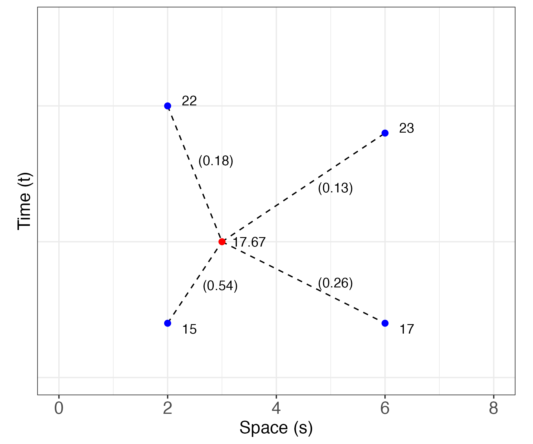 Suppose we have four observations in a one-dimensional space and a one-dimensional time domain: \(Z(2;0.2) = 15\), \(Z(2;1.0) = 22\), \(Z(6;0.2) = 17\), and \(Z(6;0.9) = 23\). We seek an S-T simple kriging prediction for \(Y(s_0;t_0) = Y(3;0.5)\). The data locations and prediction location are shown in Figure 4.1. Let \(x(s;t) = 1\) for all \(s\) and \(t\), \(\beta = 20\), and \(\textrm{var}(Y(s;t)) = 2\) for all \(s\) and \(t\). Using the spatio-temporal covariance function Equation 4.13 discussed below (with parameters \(a=2\), \(b=0.2\), \(\sigma^2 = c_{0,0} = 2.0\), and \(d=1\)), the covariance (between data) matrix \(\mathbf{C}_z\), the covariance (between the data and the latent \(Y(\cdot;\cdot)\) at the prediction location) vector \(\mathbf{c}_0\), and the weights \(\mathbf{w}' = \mathbf{c}_0' \mathbf{C}_z^{-1}\) are given by