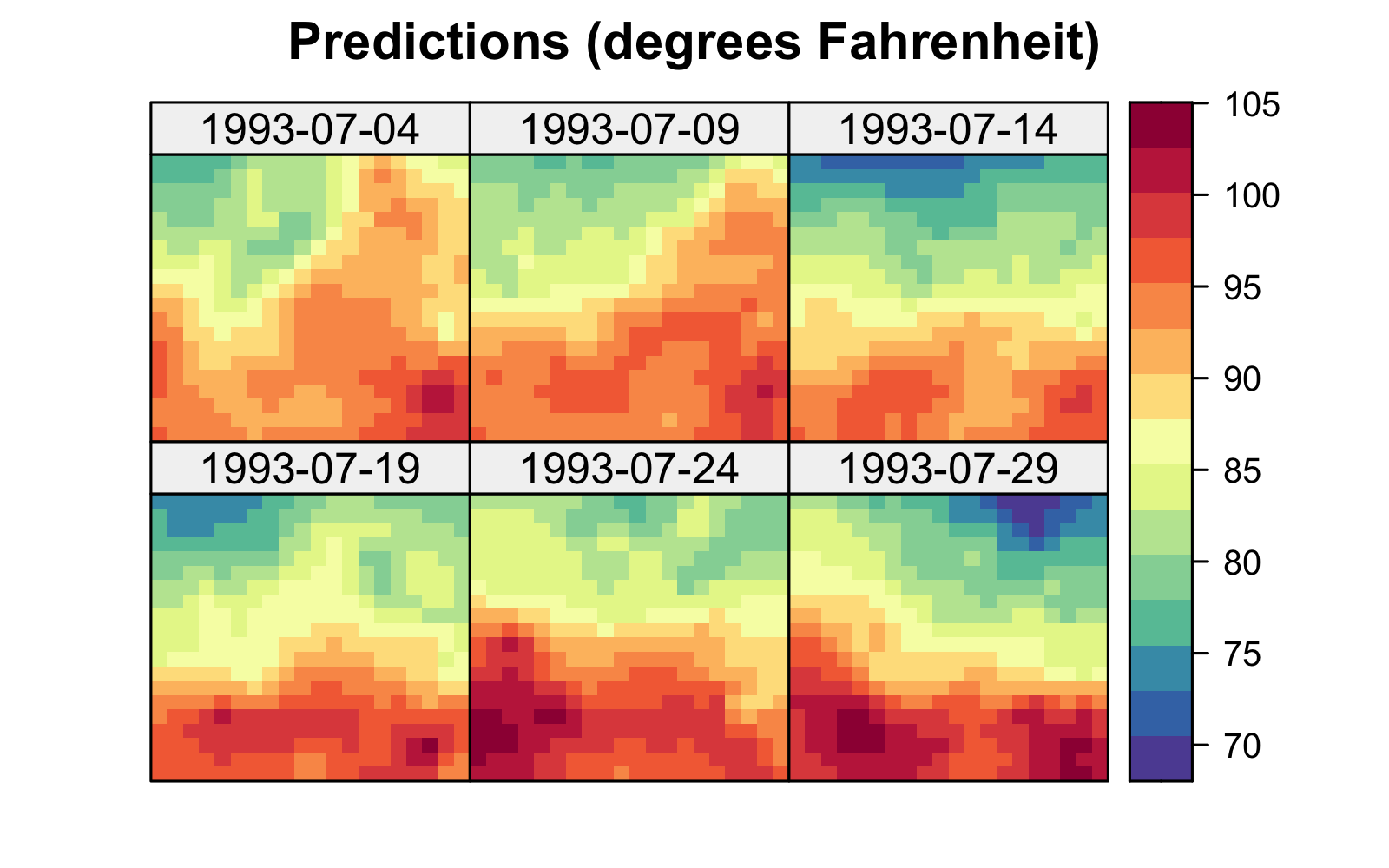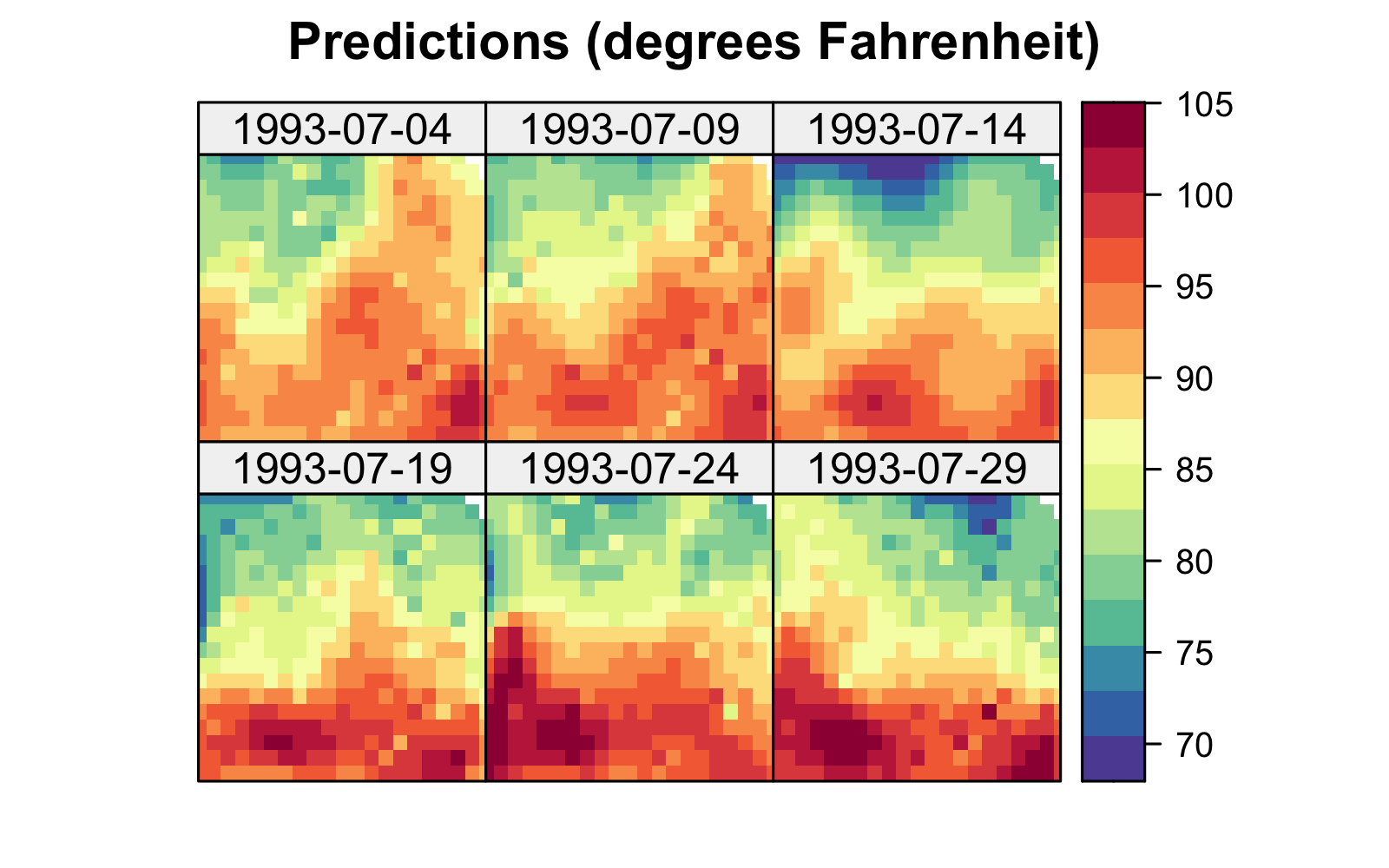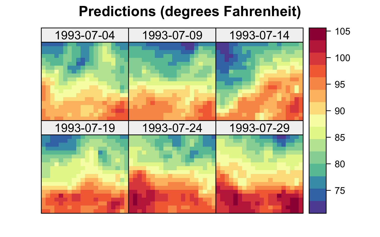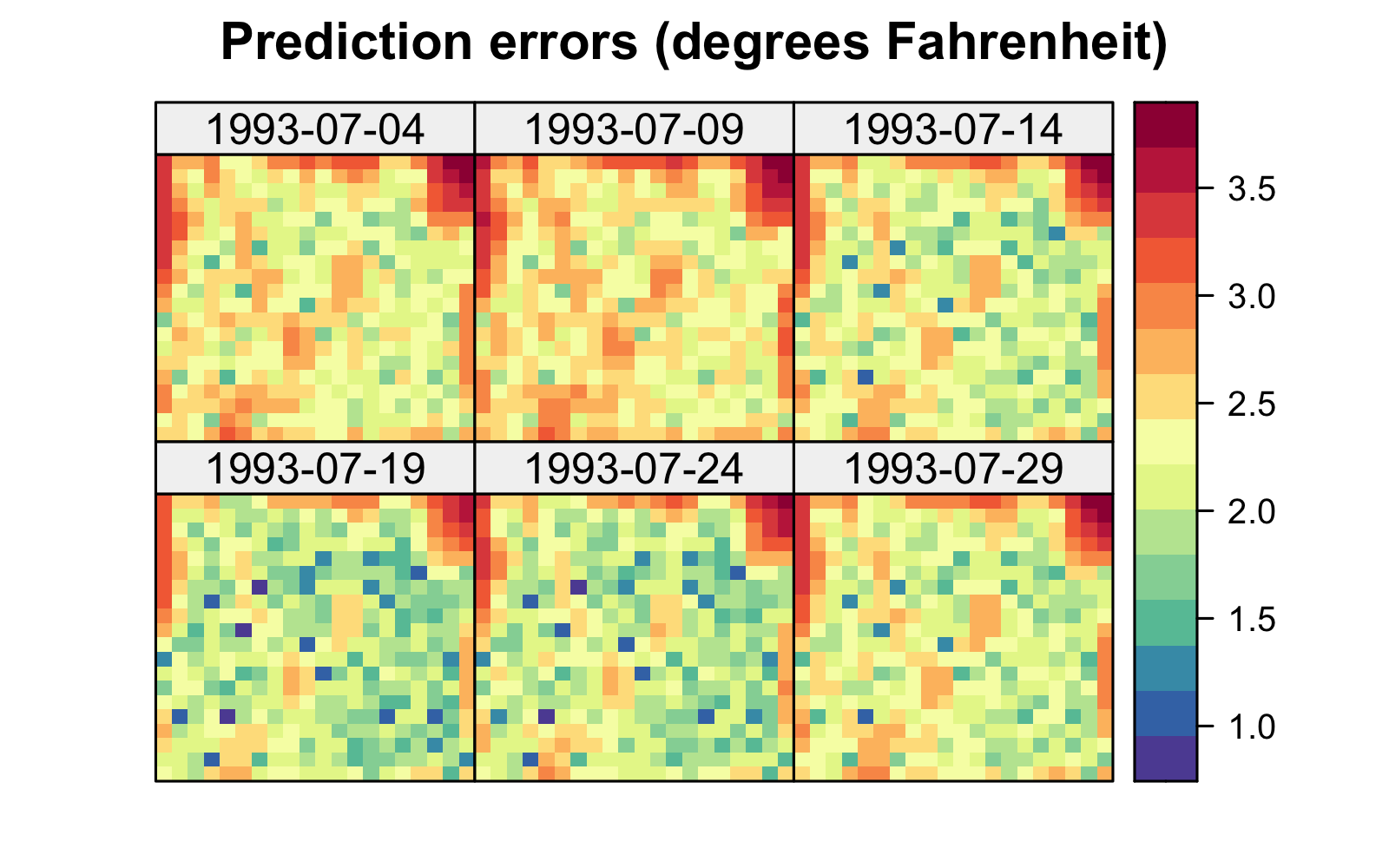 Both the S-T simple and universal kriging equations can be extended easily to accommodate prediction at many locations in space and time, including those at which we have observations. For example, in Figure 4.2, we show predictions of maximum temperature from data in the NOAA data set in July 1993 on a space-time grid (using a separable spatio-temporal covariance function, defined in Section 4.2.1), with 14 July deliberately omitted from the data set. The respective prediction standard errors are shown in Figure 4.2, where those for 14 July are substantially larger. We produce these figures in Lab 4.1.