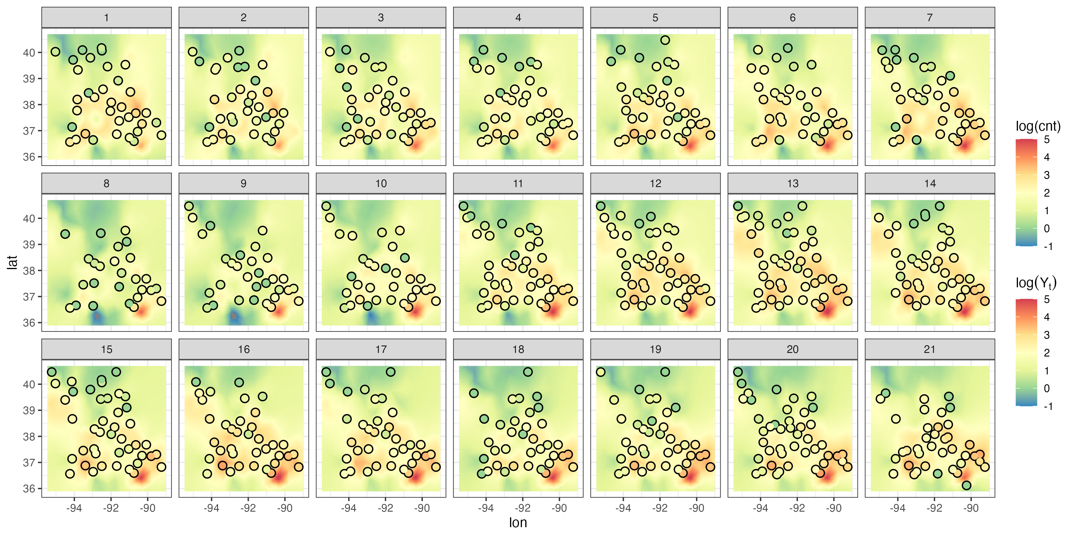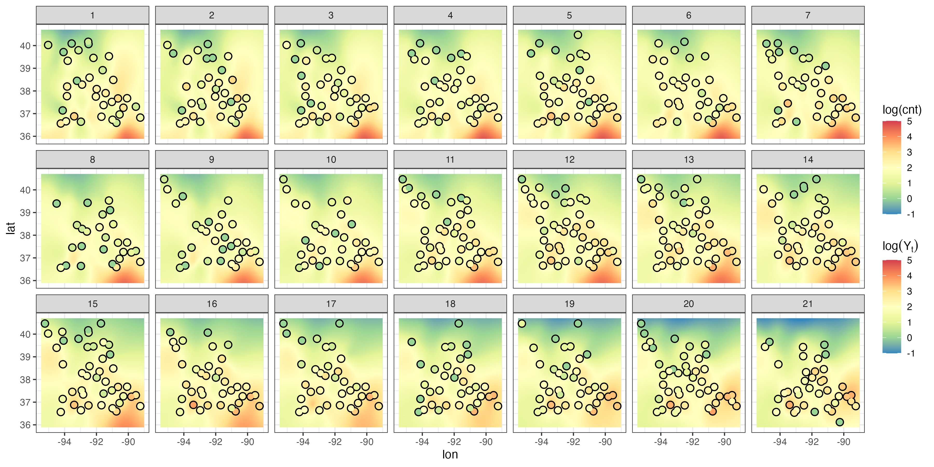 ylab=expression(p(l*"|"*Z)))We provide the prediction (posterior mean) and prediction standard error (posterior standard deviation) for \(\log(Y(\cdot))\) in Figures Figure 4.19 and Figure 4.20, respectively. These figures were generated by linearly interpolating the posterior mean and posterior standard deviation of \(\log(\mathbf{Y}^*)\) on a fine grid. Note how a high observed count at a certain location in one year affects the predictions at the same location in neighboring years, even if unobserved.