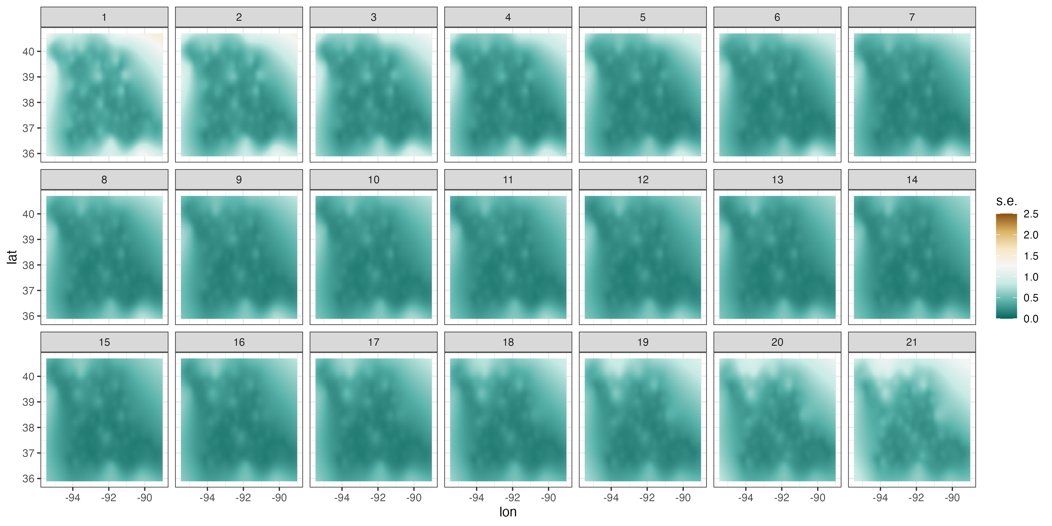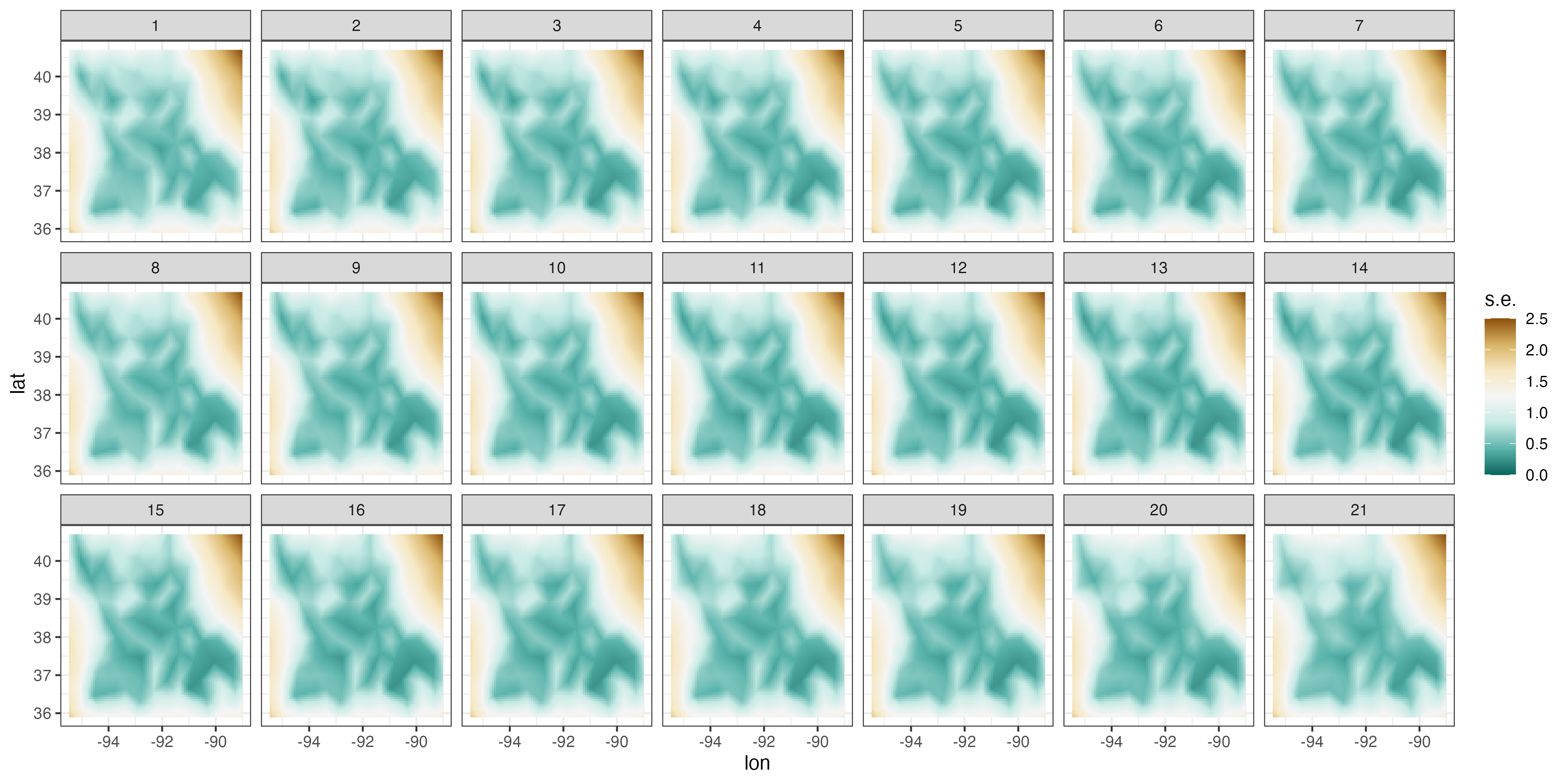 sd <- do.call("rbind", sd) %>% filter(!is.na(z))The data frames pred and sd now contain the spatio-temporal predictions and spatio-temporal prediction standard errors. Plotting of these fields using ggplot2 is left as an exercise for the reader.