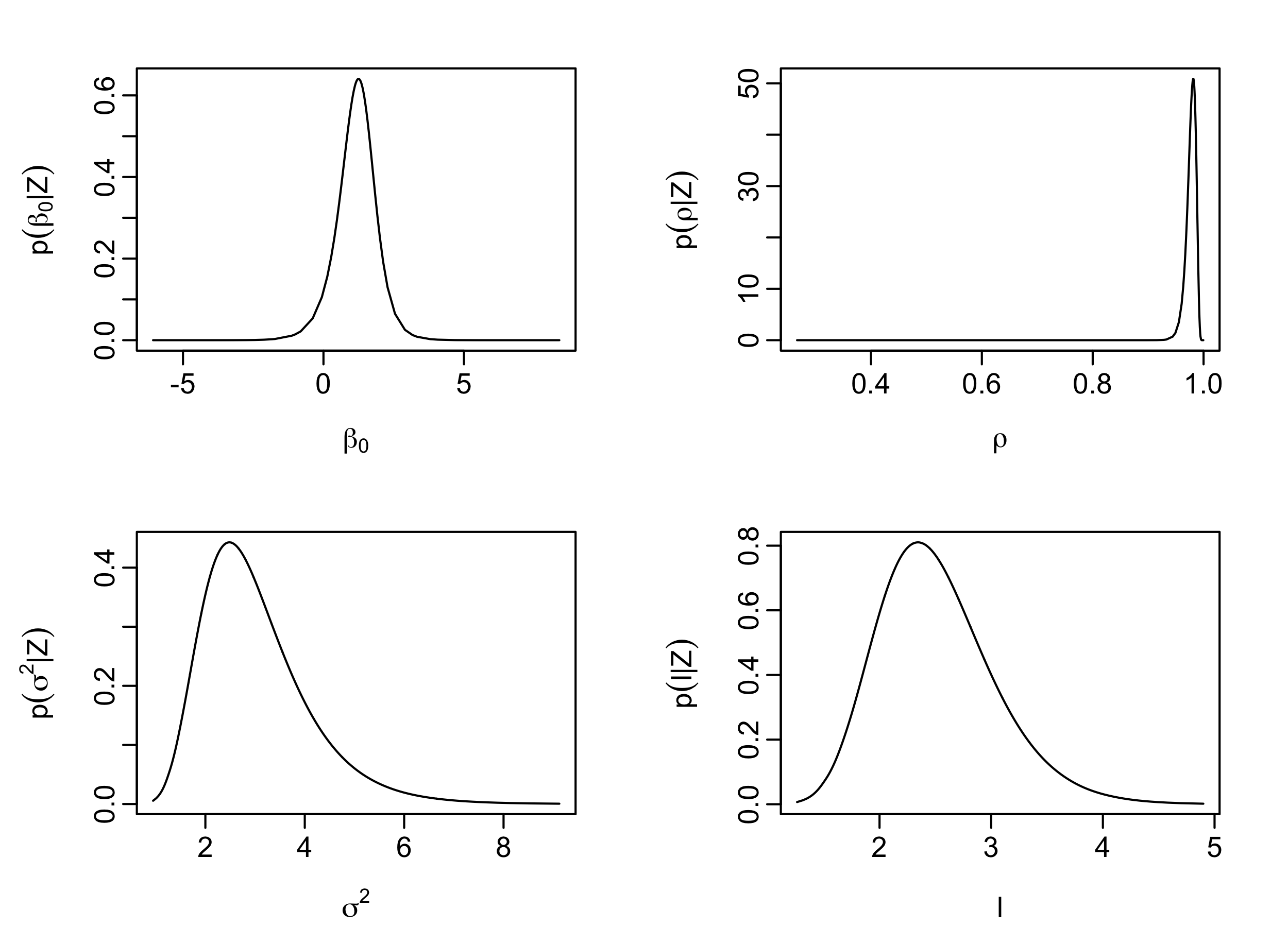 data("INLA_output", package = "STRbook")INLA provides approximate marginal posterior distributions for each \(\boldsymbol{\alpha}_t\) in \(\boldsymbol{\alpha}\) and \(\{\boldsymbol{\beta},\rho,\tau\,\kappa\}\). The returned object, output, contains all the results as well as summaries of these results for quick analysis. From the posterior distributions over the precision parameter \(\tau\) and scale parameter \(\kappa\), we can readily obtain marginal posterior distributions over the more interpretable variance parameter \(\sigma^2\) and practical range parameter \(l\). Posterior distributions of some of the parameters are shown in Figure 4.18, where we can see that the AR(1) coefficient of the latent field, \(\rho\), is large (most of the mass of the posterior distribution is close to \(1\)), and the practical range parameter, \(l\), is of the order of 2 degrees (\(\approx 200\),km). The posterior distribution of the marginal variance of the latent field is largest between 2 and 4. These values suggest that there are strong spatial and temporal dependencies in the data. We give code below for plotting the posterior marginal distributions shown in Figure 4.18.