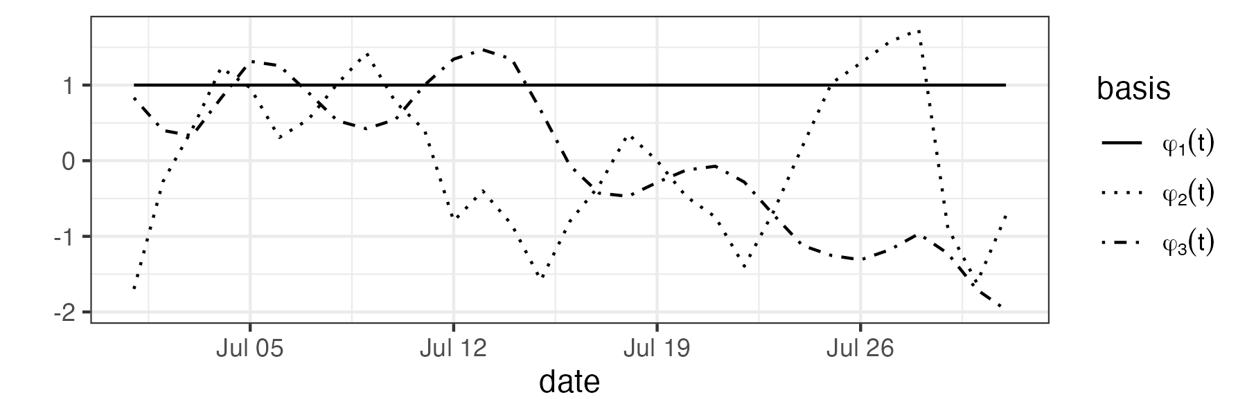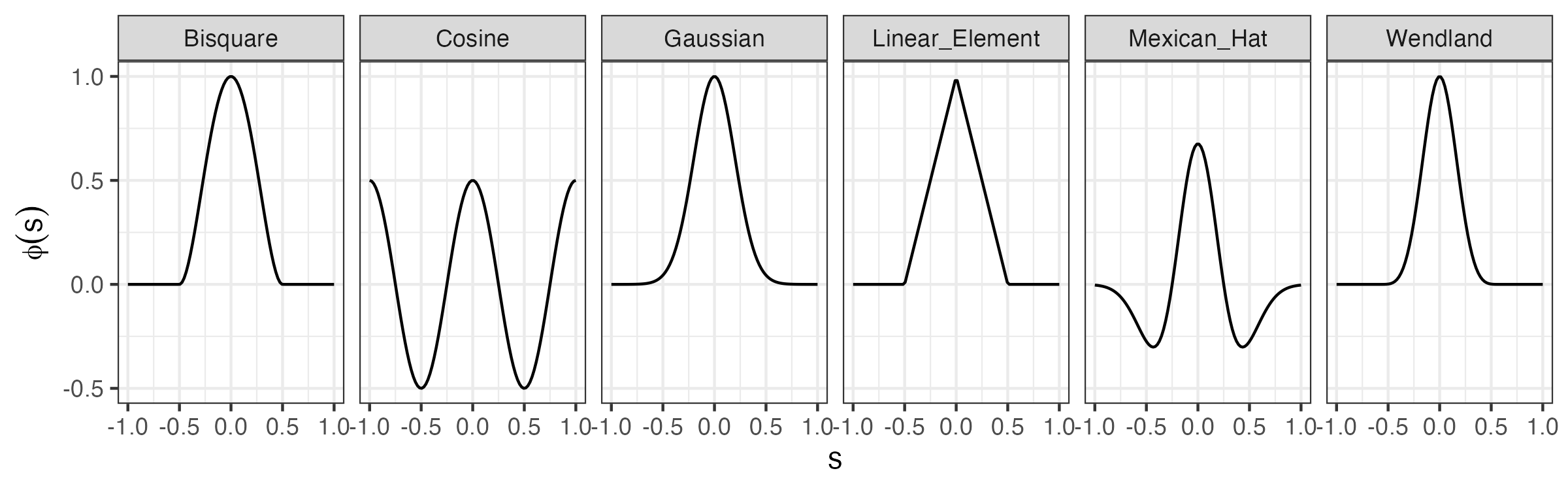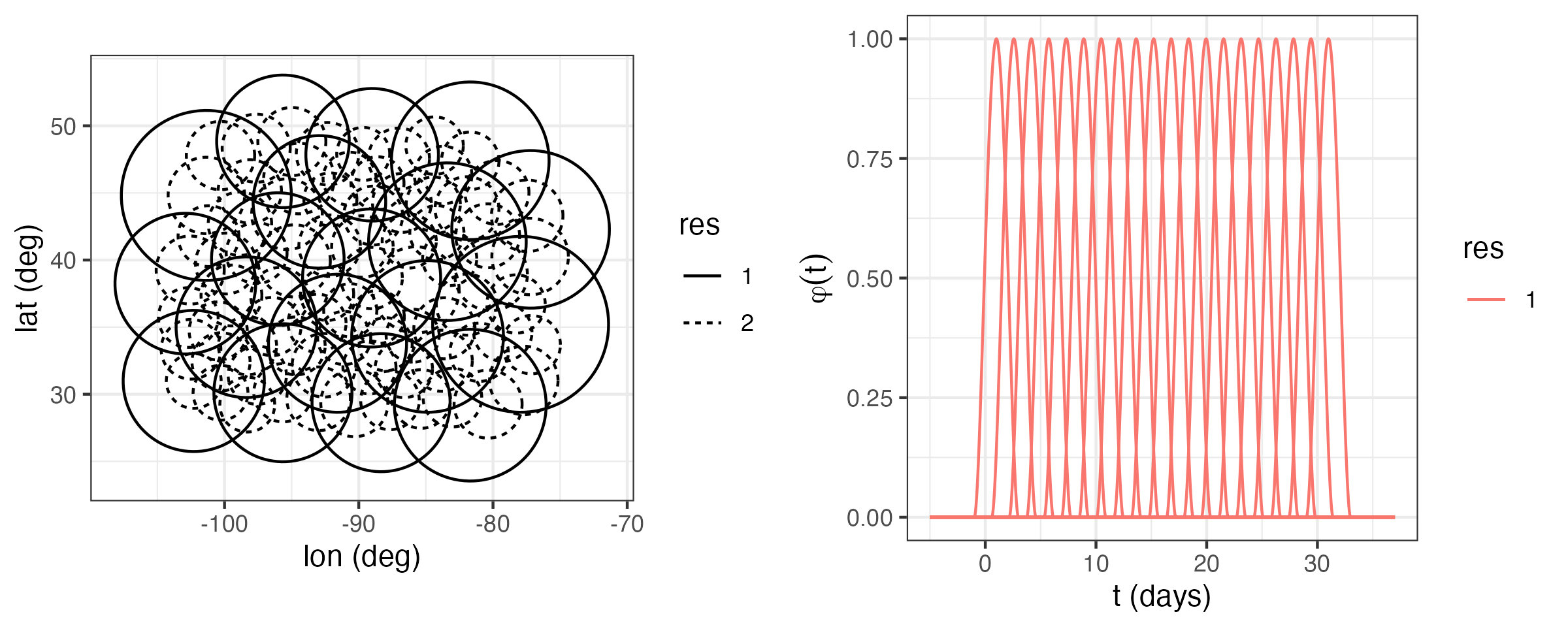 The second way that s are useful for spatio-temporal modeling is for forming spatio-temporal , which we discuss in Section 4.4. In particular, if we construct an \(m \times n_{\alpha,s}\) matrix \(\boldsymbol{\Phi}\) by evaluating \(n_{\alpha,s}\) spatial basis functions at \(m\) spatial locations, and a \(T \times n_{\alpha,t}\) matrix \(\boldsymbol{\Psi}\) by evaluating \(n_{\alpha,t}\) temporal basis functions at \(T\) temporal locations, then the matrix constructed from spatio-temporal basis functions formed through the tensor product of the spatial and temporal basis functions and evaluated at all combinations of spatial and temporal locations is given by the \(m T \times n_{\alpha,s} n_{\alpha,t}\) matrix \(\mathbf{B}= \boldsymbol{\Psi}\otimes \boldsymbol{\Phi}\). Basis functions can be used to construct spatio-temporal covariance functions. Note that using a set of basis functions constructed through the yields a class of spatio-temporal covariance functions that are in general not separable.