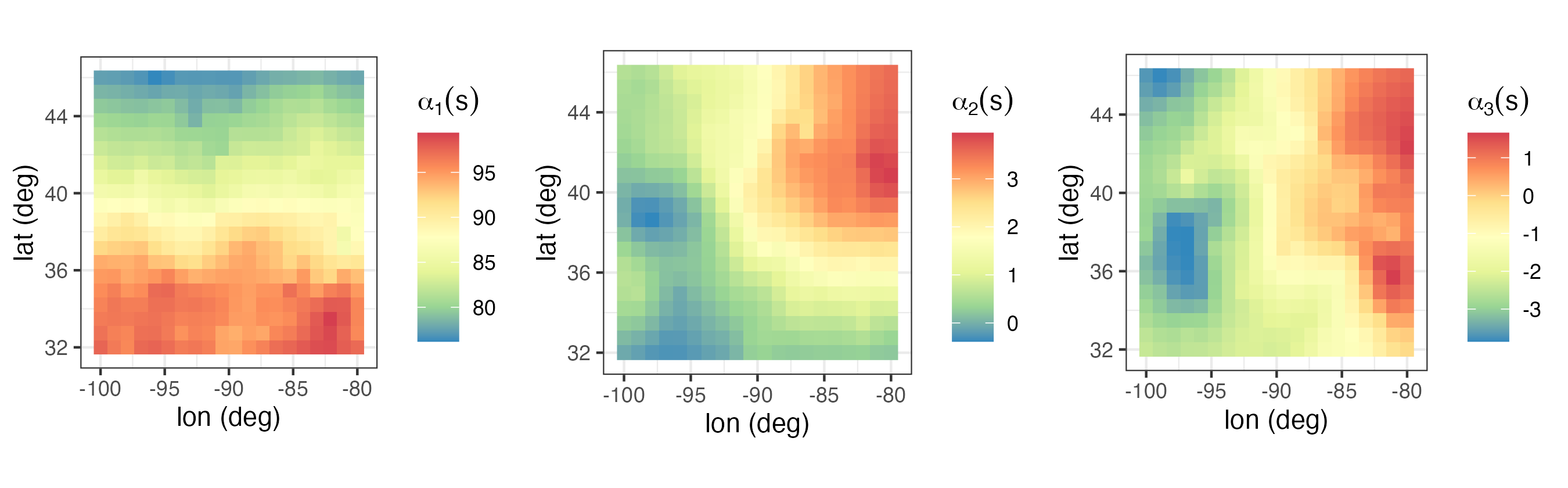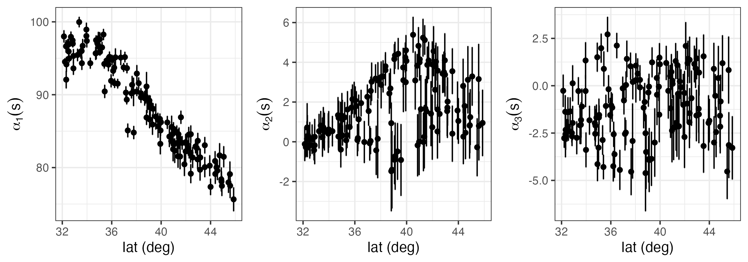 Plotting spatial fields, such as those shown in Figures Figure 4.19 and Figure 4.20, from the INLA output can be a bit involved since each prediction and prediction standard error of \(\boldsymbol{\alpha}_t\) for each \(t\) needs to be projected spatially. First, we extract the predictions and prediction standard errors of \(\boldsymbol{\alpha}= (\boldsymbol{\alpha}_1',\dots,\boldsymbol{\alpha}_T')'\) as follows.