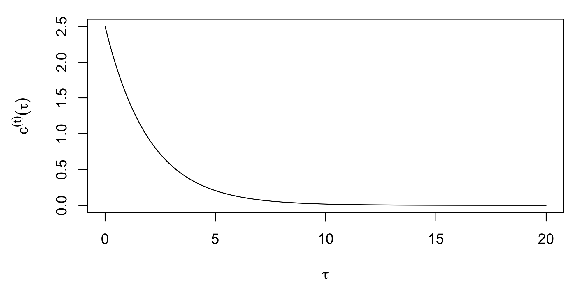 where \(\sigma_s^2\) is the variance parameter and \(a_s\) is the spatial-dependence (or scale) parameter in units of distance. The larger \(a_s\) is, the more dependent the spatial process is. Similarly, \(c^{(t)}(\tau) = \sigma_t^2 \exp\{-|\tau|/a_t\}\) is a valid temporal covariance function (see Figure 4.3 for an example).
