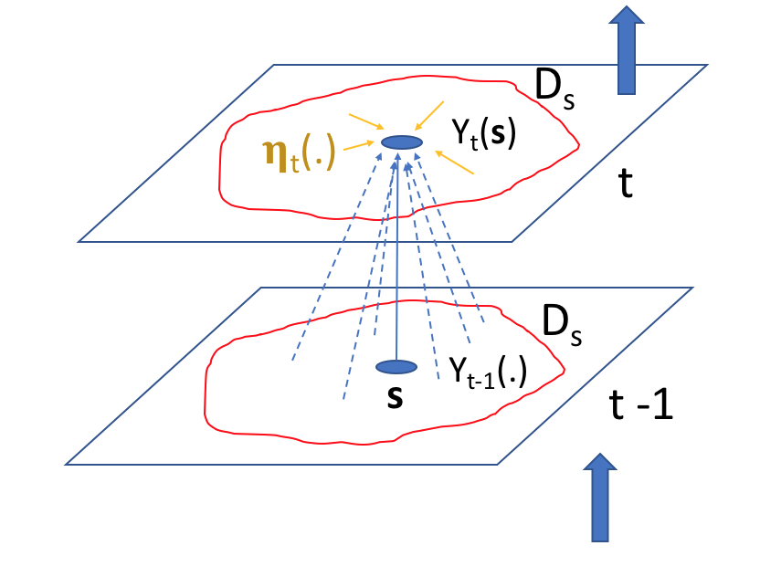 This first-order-Markov assumption, which is simple but powerful in spatio-temporal statistics, holds when \(\{Y_t(\cdot)\}\) follows a dynamic model of the form
