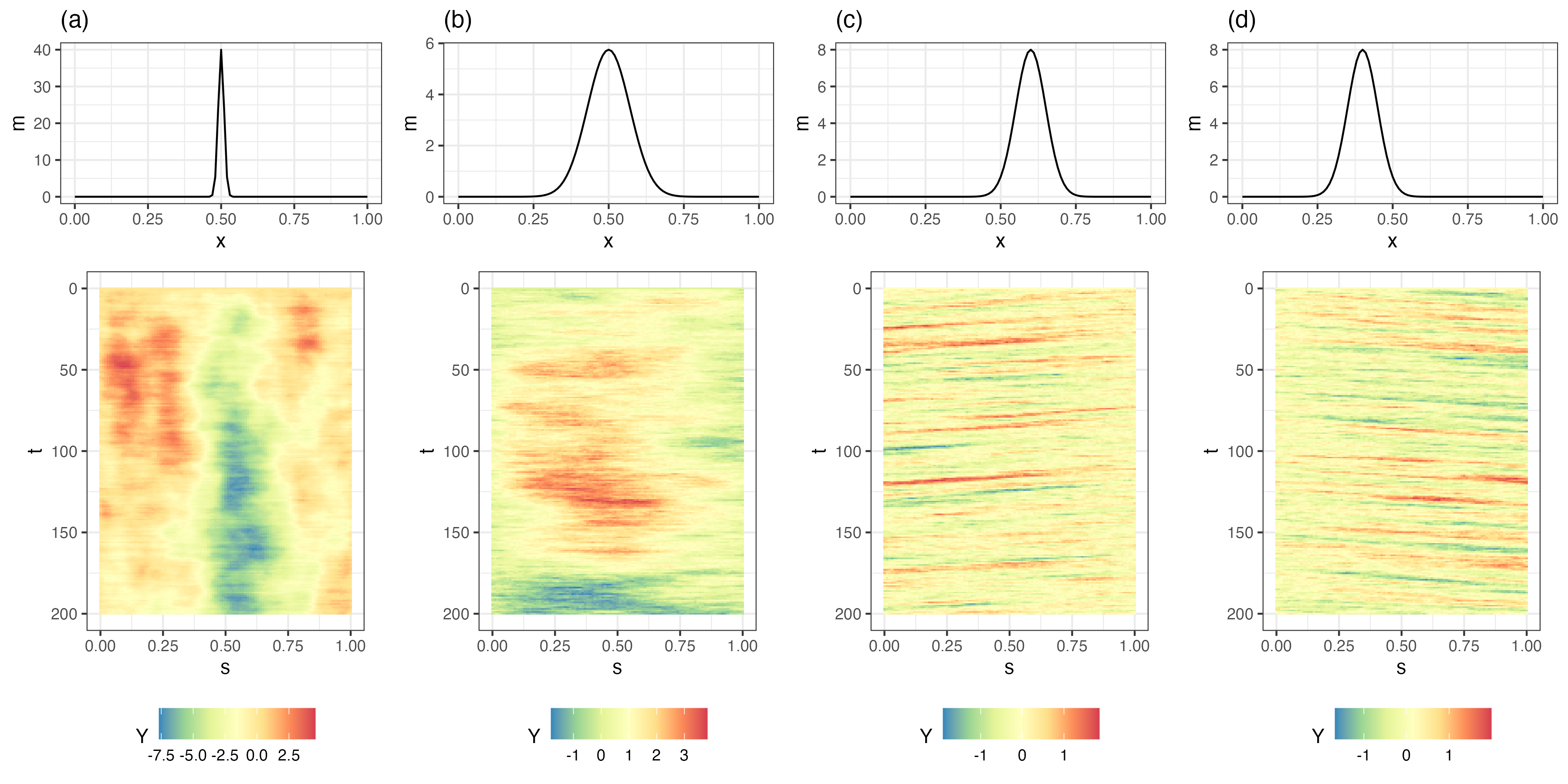 Parameterizations of realistic dynamics should respect the fact that spatio-temporal interactions are crucial for dynamic propagation. For example, in the linear IDE model (Equation 5.9), the asymmetry and rate of decay of the transition kernel \(m(\mathbf{s},\mathbf{x};\boldsymbol{\theta}_p)\), relative to a location (here, \(\mathbf{s}\)), control propagation (linear advection) and spread (diffusion), respectively. Figure 5.2 shows Hovmöller plots of four one-dimensional (in space) simulations of a spatio-temporal IDE process and their respective transition kernels evaluated at \(s_0 = 0.5\). Panels (a) and (b) show the inherent diffusive nature of the process depending on kernel width; that is, spatially coherent disturbances tend to spread across space (diffuse) at a greater rate when the kernel is wider (i.e., has a larger aperture), which leads to more averaging from one time to the next. However, note that there is no “slanting” in the plot through time, indicating that there is no propagation through time (see Section 2.3.3 for an interpretation of Hovmöller plots). In contrast, panels (c) and (d) show clear evidence of propagation, to the left when the kernel is offset to the right, and to the right when the kernel is offset to the left. The intuition here is that the offset kernel pulls information from one particular direction, and redistributes it in the opposite direction, leading to propagation. More complex kernels (e.g., multimodal, or spatially varying) can lead to even more complex behavior. As we discuss in Section 5.3, these basic properties of the transition (redistribution) kernel can suggest efficient parameterizations of linear DTSM process models.