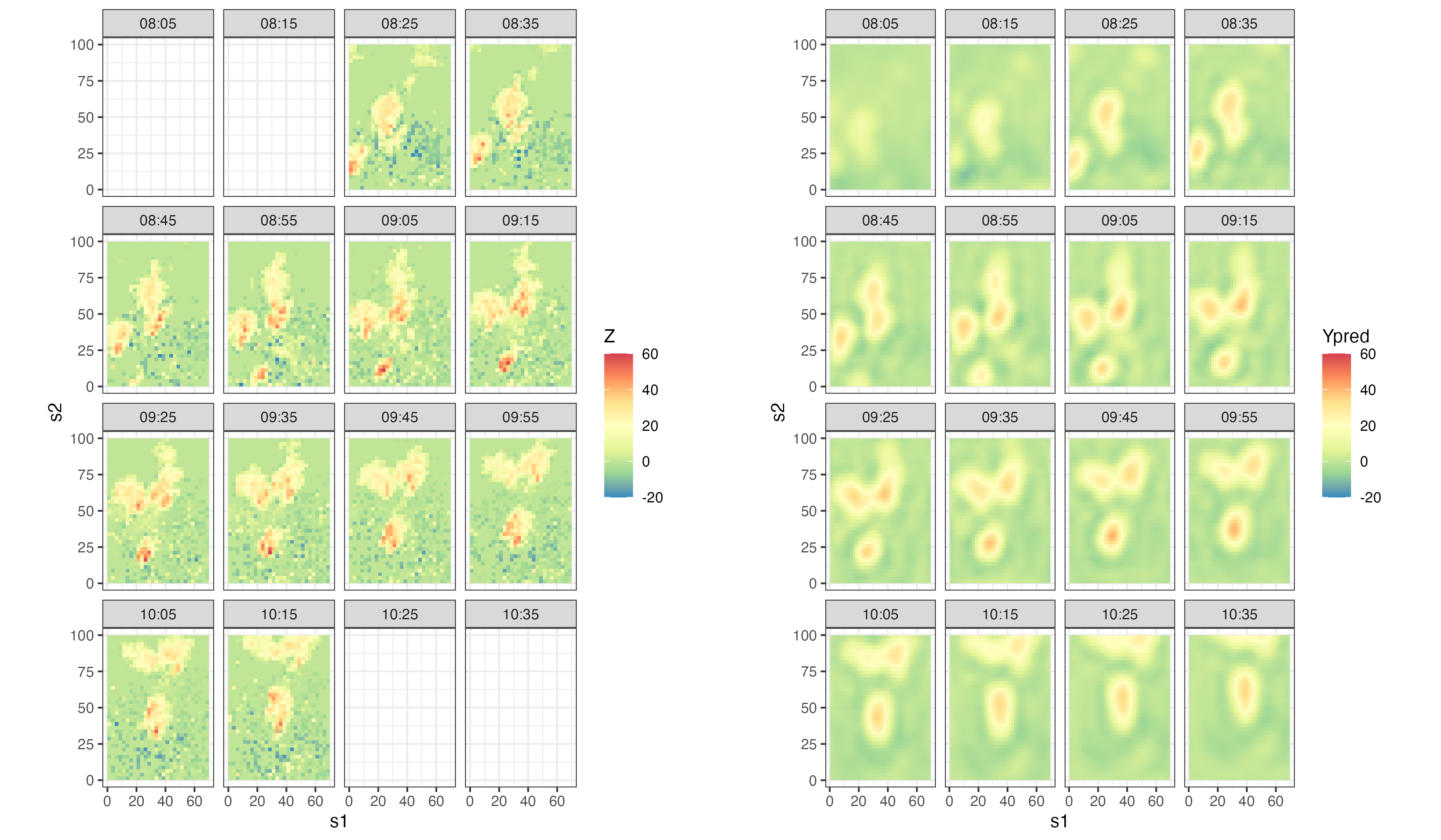 fill_scale(limits = c(-20, 60), name = "Ypred")The plots are shown in Figure 5.6. Notice how both the forecasts and the hindcasts incorporate the information on transport that is evident in the data. We did not plot prediction standard errors in this case, which is left as an exercise for the reader.